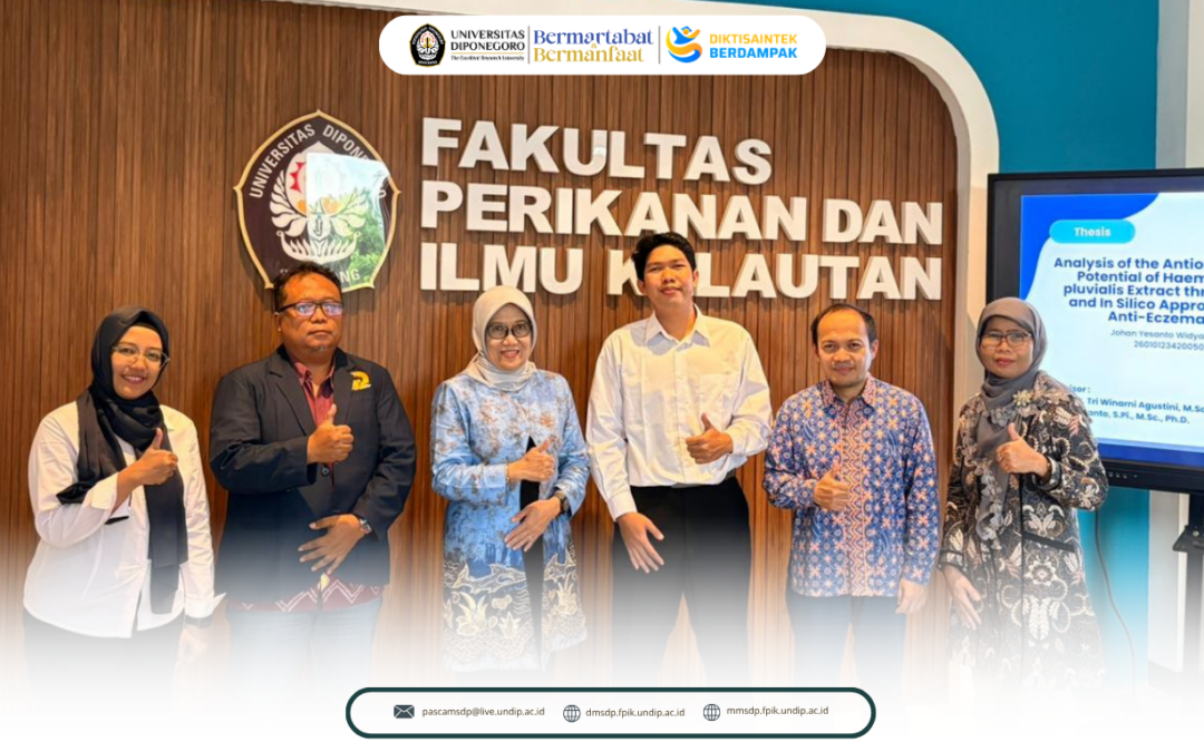 Kegiatan ini dihadiri Prof. Ir. Tri Winarni Agustini M.Sc, Ph.D. (Pembimbing 1), Eko Susanto, S.Pi., M.Sc., Ph.D. (Pembimbing 2), Dr. Putut Har Riyadi, S.Pi, M.Si. (Penguji), Dr. Ir. Sri Sedjati, M.Si. (Penguji), Dr. Aninditia Sabdaningsih, S.Si., M.Si Pengelola). Berdasarkan pemaparan yang telah disampaikan, saudara Johan dinyatakan dapat LULUS dengan revisi minor (tidak merubah konsep tetapi merubah atau memperbaiki format). Tetap semangat menuju Gelar Magister!🔥